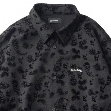 肌触りが柔らかく、ドレープ感のあるレーヨン混素材を採用。ブランドを象徴するペイズリー柄を全体にフロッキー加工で施しました。ノーマルプリントとはひと味違う独特の立体感・表面感が魅力。