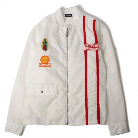 「スタンドカラータイプのレーシングジャケット。表地には撥水、アクリルコーティング加工を施した中肉のナイロン生地を採用。ウォッシュ加工を施し、ヴィンテージのようなパッカリングを再現。