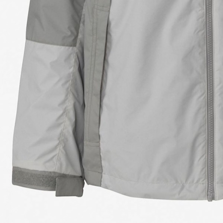 ベンチレーション兼用のファスナーポケットにより、衣服内のムレを素早く排出。裏地は肌離れのよいポリエステルメッシュを採用。両サイドと両胸にベンチレーション兼用のファスナーポケット。ビルトインフードを装備。袖口は面ファスナーでフィット感の調節が可能。