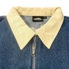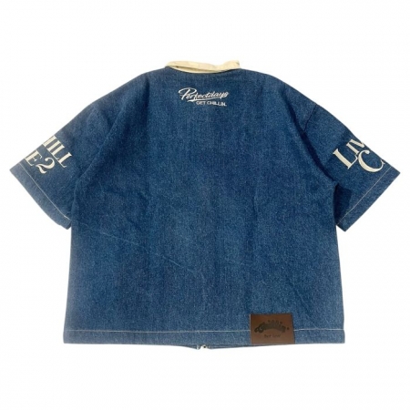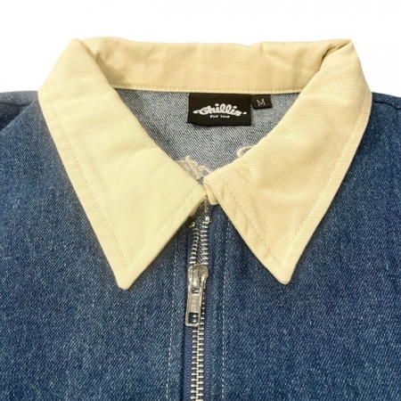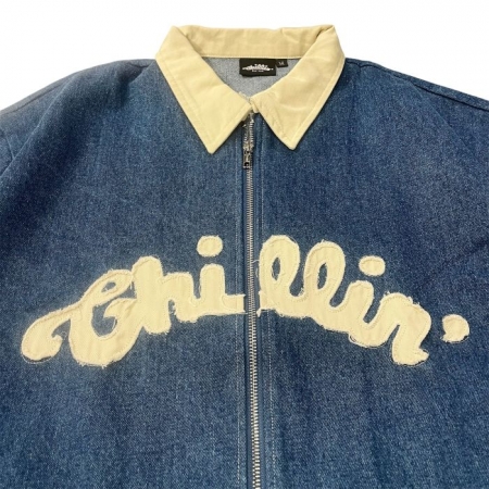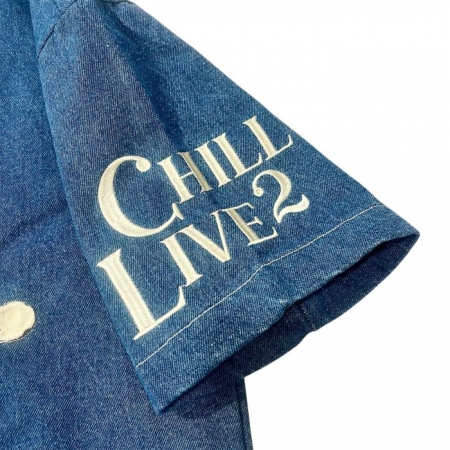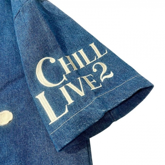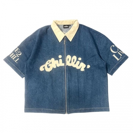 適度なウォッシュと刺繍を施した、フロントジップのデニム半袖シャツジャケット。フロントに Chillin' アーチロゴのタックル刺繍、左右袖に LIVE2CHILL、CGILL2LIVE の刺繍入り。