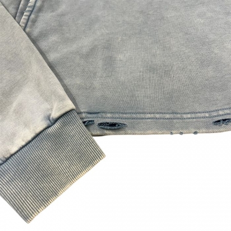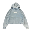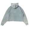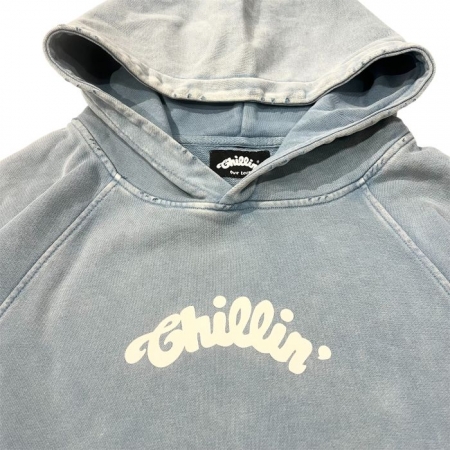 WASH 加工を施し、ダメージを加えたクロップド丈のフーディーです。フロントは CHILLIN のBIG ロゴのプリント、裾の折り返し部分にはダメージ加工が施されています。フロントの切り替えデザインが特徴で、両サイドにはポケットも完備。身幅は広め、着丈は短めのシルエットで、ジャケットのインナーや春先の一枚着としてもお楽しみいただけます。また、レイヤードスタイルにも適した、汎用性の高い一枚です。