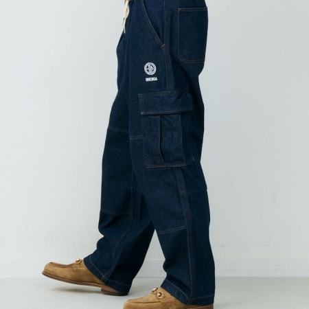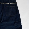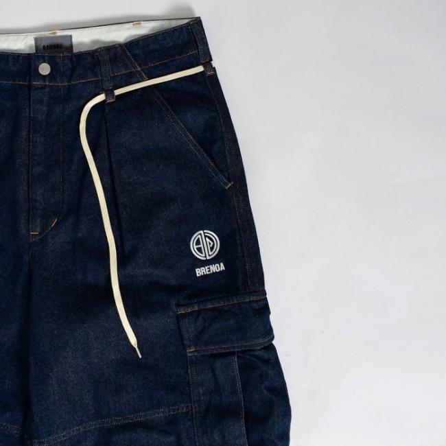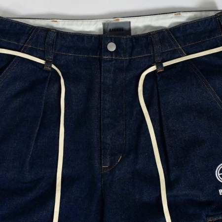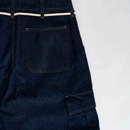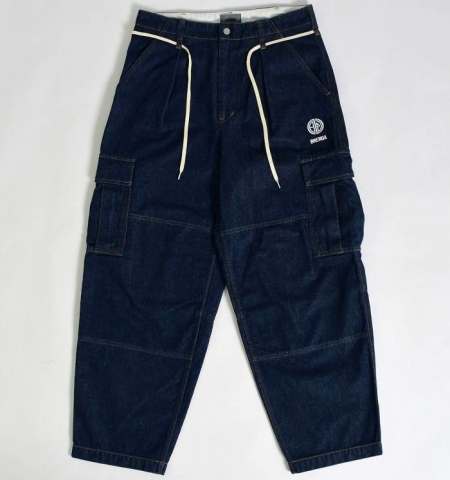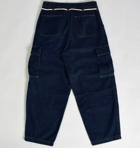 岡山デニムを使用したワンウォッシュ仕上げのテーパードパンツ。カーゴパンツをベースに、ゆとりを持たせつつ、裾にかけてテーパードを効かせたシルエット。立体的なフォルムで、ワイドながらもすっきりとした印象に仕上げている。膝裏には当て布を施し、表面にはステッチのみが出る仕様で、動きに対応しつつスタイリッシュに仕上げた。ベルトループの下には、シューレース専用ループを追加。シューレースをベルト代わりにしていたストリート背景をリスペクトし、着用時にも安定して固定できる仕様にした。