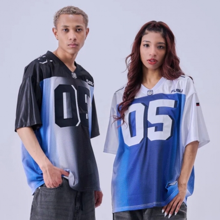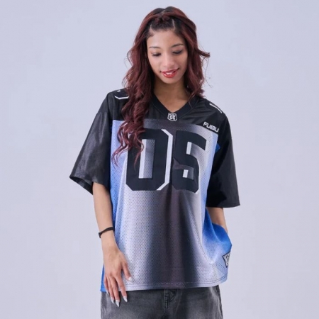 大胆なグラデーションデザインとナンバリング「05」を組み合わせたゲームシャツです。軽量で動きやすいポリエステルジャージとメッシュ素材を組み合わせて使用。通気性が良く、汗をかいても蒸れにくい快適な着心地です。フロントとバックにナンバリングを配置し、スポーツユニフォームをイメージしたストリート感のあるデザインに仕上がっています。