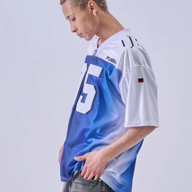 大胆なグラデーションデザインとナンバリング「05」を組み合わせたゲームシャツです。軽量で動きやすいポリエステルジャージとメッシュ素材を組み合わせて使用。通気性が良く、汗をかいても蒸れにくい快適な着心地です。フロントとバックにナンバリングを配置し、スポーツユニフォームをイメージしたストリート感のあるデザインに仕上がっています。
