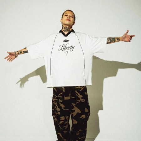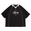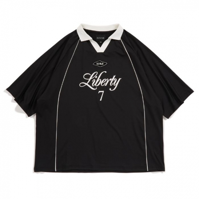 フロントに "Liberty" = ”自由" を掲げ、襟とパイピングがアクセントになったゲームシャツです。