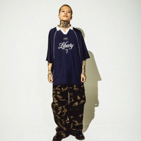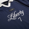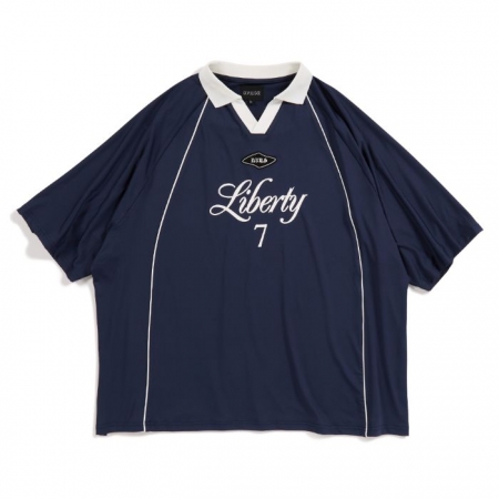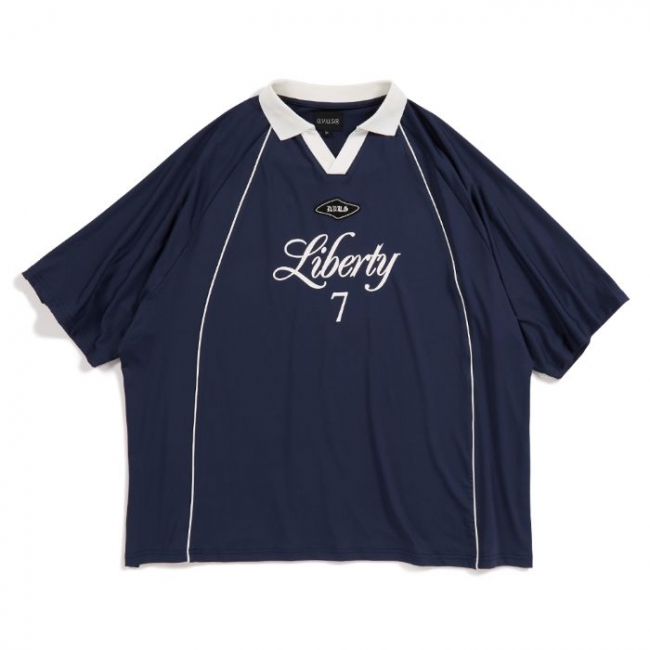フロントに "Liberty" = ”自由" を掲げ、襟とパイピングがアクセントになったゲームシャツです。