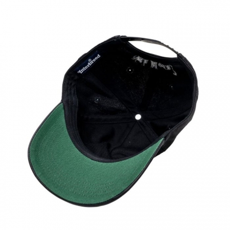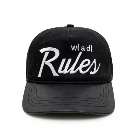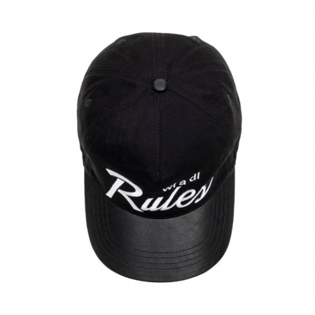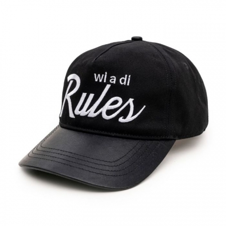 着用時の綺麗なフォルムや適度な深さが特徴のオリジナルシルエットで、クラウンにはコットンツイル生地を使用、バイザーとトップボタンは切り替えでレザー(本革)を使用しています。バイザーは緩やかなラウンドタイプ、後部はスナップ仕様となっています。フロントパネルには ”Wi a di Rules” (俺たちがルール、パトワ語)のスクリプト刺繍、後部には Mah Mean? (分かる?) の刺繍が入ります。