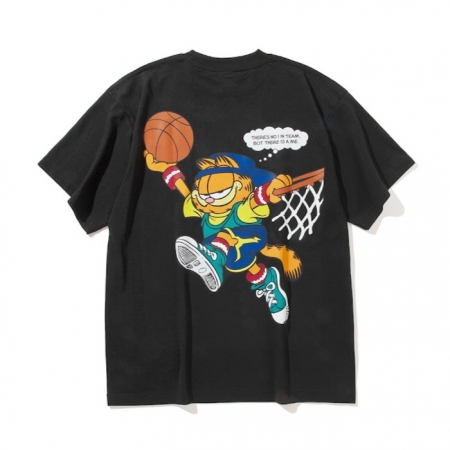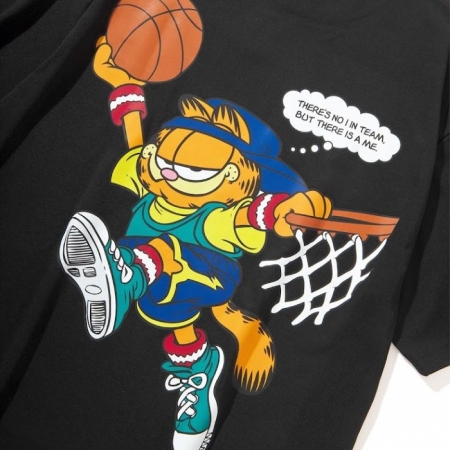 「月曜が大嫌い。週末のために生きる。1978年にアメリカの新聞漫画で誕生、世界一有名になったぽっちゃり猫 ガーフィールドと FLATLUX のスポーツライン FLATLUX BST とのコラボレーション。 某有名選手のセレモニーでの、某有名選手の爆笑スピーチに思いを馳せて。吸水速乾、ポリエステルの機能性とコットンのなめらかな肌ざわり、両者のいいとこ取りをしたポリ/綿 混紡生地。 普通の Tシャツと近い生地感なので、普段も着れるしドライ Tシャツのペカペカつるつるのあの感じが苦手な方にもオススメ。」