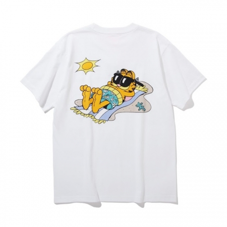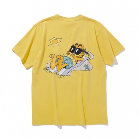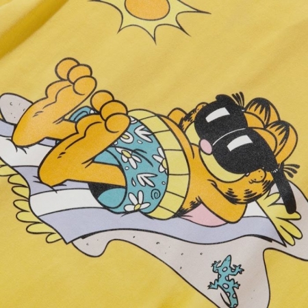 「月曜が大嫌い。週末のために生きる。 1978年にアメリカの新聞漫画で誕生、世界一有名になったぽっちゃり猫 ガーフィールドと FLATLUX のコラボレーション。 砂の上でチル。いやぁ、VACAY(Vacation) VIBES 誰よりも感じてますね。 見習いたい。」